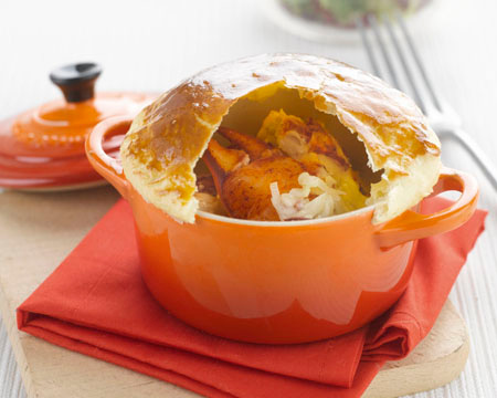 - 3Prendre le rond de pâte feuilletée et le fixer sur la mini-cocotte comme un couvercle. A l'aide d'un pinceau, badigeonner la pâte de jaune d'oeuf, la coloration s'en trouvera améliorée.