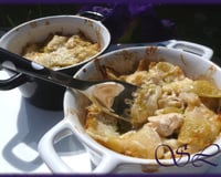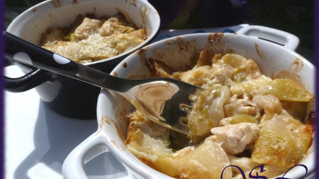 Préparez vos cassolettes : un peu de sauce au fond, les morceaux de poulet, les rondelles de poireaux. Recouvrez de sauce à la moutarde et râpez sur le dessus le fromage Pécorino (fromage Italien que vous pouvez remplacer par du parmesan).