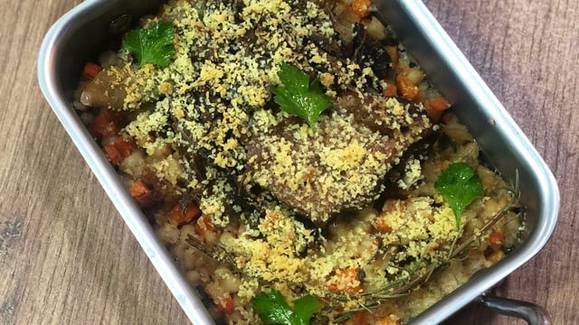 Pour la chapelure : presser la gousse d’ail et la mélanger dans un bol avec la chapelure. Ajouter la moitié du persil et verser une rasade d’huile d’olive.