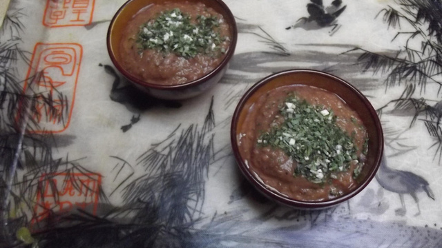 Mettre les ingrédients cuits avec leur jus de cuisson dans un bol et mixer avec un mixeur plongeant. On peut le faire dans le récipient d'un mixeur à lames mais dans ce cas, les produits mixés doivent repasser par un mixeur-shaker pour plus d'homogénité.