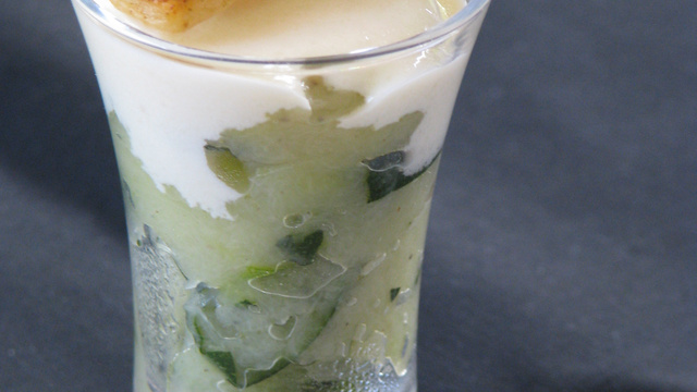 Dresser la courgette dans les verrines, ajouter la crème sur le dessus et décorer d'une allumette.