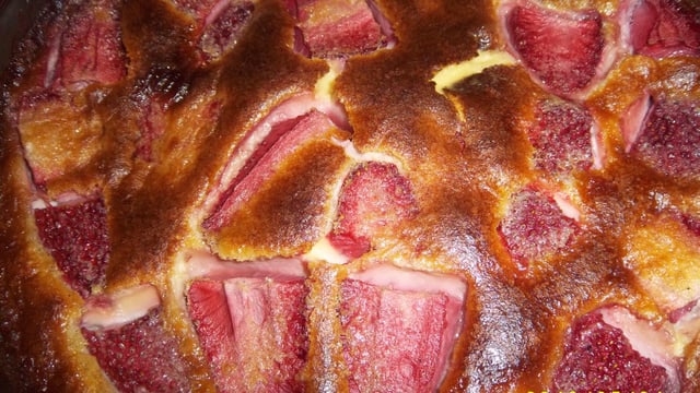 Déposez les fraises dans un moule à manqué beurré et fariné puis recouvrir avec la préparation. Enfourner 45 à 50 mn à 180/200°C. Déguster bien froid.