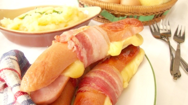 Enfourner les cervelas pendant 15 minutes, ils doivent être bien dorés, le lard - juste grillé et le fromage - fondu.