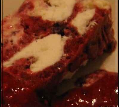 5. Dans un moule à cake, faire des 'lasagnes" en commençant par des fruits entiers non surgelés pour décorer ce qui sera le dessus du 'gateau" (par exemple des fraises coupées en deux et des myrtilles), puis en ajoutant le mélange de fruits/glace/confiture, bouts de meringues, quelques cuillères additionelles de glace non mélangée, fruits entiers, mélange de fruits/glace/confiture, meringues... Bien tasser et remplir le moule jusqu'en haut!