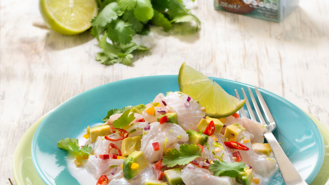 Recouvrez de film étirable et réservez 1 heure au frais. Au moment de servir, détaillez-les avocats en petits cubes, salez et arrosez-les du jus de citron vert. Hachez la coriandre. Répartissez le poisson, la garniture et l’avocat sur les assiettes de service. Parsemez de coriandre et servez aussitôt.