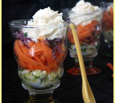 Déposer dans de grands verres un peu de mélange coquilles St-Jacques - dorade avec 1 cs de marinade, des lamelles de courgettes et carottes, un peu d'oignon et terminer par le choux rouge.