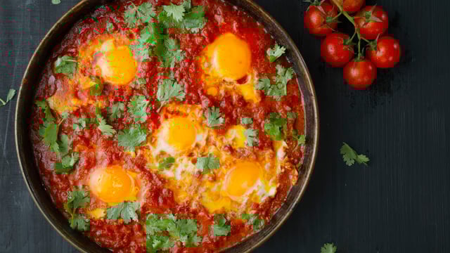 Laisser cuire á feu doux les œufs dans la chakchouka á couvert pour faciliter la cuisson des œufs. 10 min c'est suffisant normalement.