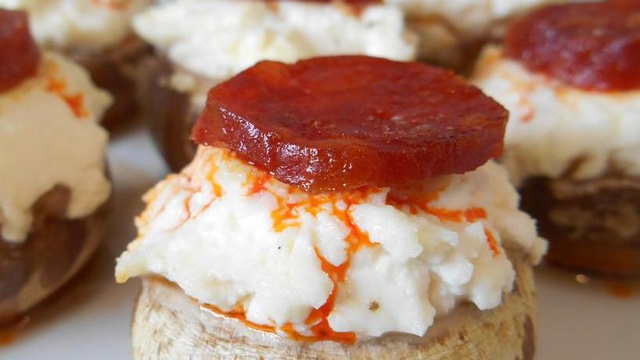 Laver, sécher et équeuter les champignons.Farcir les têtes des champignons avec le philadelphia et déposer sur le dessus une fine rondelle de chorizo.