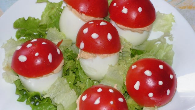 Laver les tomates et couper un chapeau aux ¾. Poser un chapeau de tomate sur chaque œuf puis décorer de petites touches de crème pour imiter les champignons. Servir sur un lit de salade et avec le reste des tomates coupées en dés.
