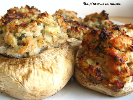 Farcir les champignons avec la préparation et saupoudrer de chapelure. On peut ajouter un filet d'huile d'olive ou une noisette de beurre. Enfourner pour 40 minutes.