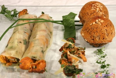Egoutter les feuilles de poireaux, les étendre en les superposant pour former des rectangles. Ajouter un peu de champignons et de persil et rouler en cylindre. Décorer avec le reste de sauté, du persil et les faux champignons de châtaignes. Servir (chaud) aussitôt.