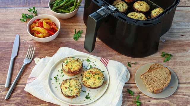 Faites cuire les champignons farcis dans le Airfryer à 200°C pendant 7 minutes, jusqu’à ce qu'ils soient légèrement dorés à la surface.