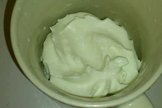 Au bout des deux heures, sortez là et la verser dans des verrines. C'est bon à déguster avec modération car si on en met beaucoup ça peut être légèrement écoeurant. J'avais fait un gâteau au yaourt comme accompagnement.