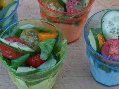 - Pour la chantilly qui rit :- Fouetter la crème fraîche et la garder assez souple comme une chantilly.- Ramillir au fouet les vaches dans un saladier et incorporer délicatement la crème fouetté.- Assaisonner légèrement.- Mettre délicatement la chantilly au fond des verrines.Pour les verrines :- Disposer sur la chantilly la salade de mâche et les tomates cerises découpées avec harmonie.- Ajouter quelques tranchettes de concombre.- Arroser les cruditées d'un filet d'huile d'olive et de vinaigre.- Saler à la fleur de sel et ajouter un tour de poivre du moulin.Servir aussitôt !