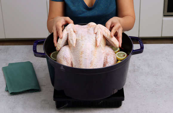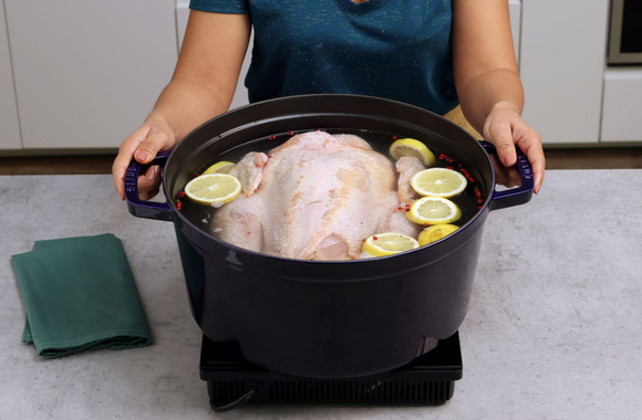 2Une fois l’eau à ébullition, plongez-y entièrement le chapon.