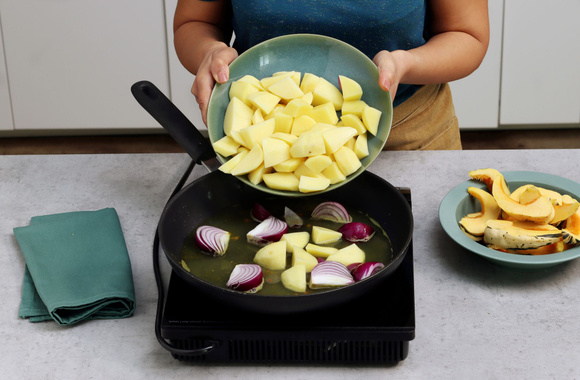 5Pendant la cuisson du chapon, épluchez les pommes et coupez-les en cubes. Coupez le patidou en lamelles. Épluchez l'oignon et coupez-le en quartier.