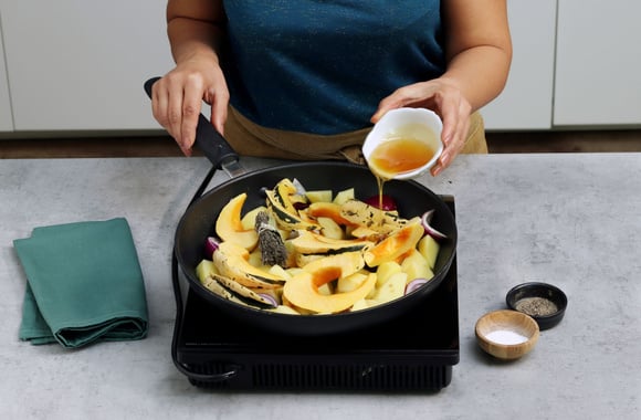 6Ajoutez les lamelles de patidou, le laurier, le thym, le bouillon et le miel.