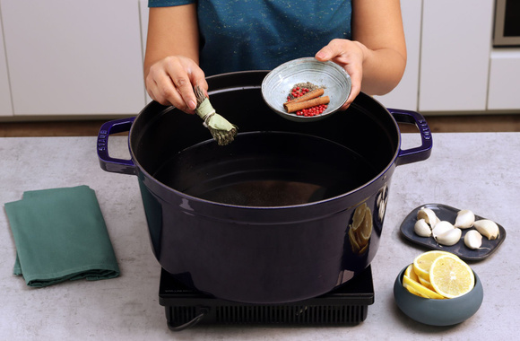 Faites chauffer 2 litres d'eau avec les bâtons de cannelle, les clous de girofle, les citrons coupés en rondelles, les gousses d'ail non pelées, le bouquet garni, le poivre concassé et le sel.
