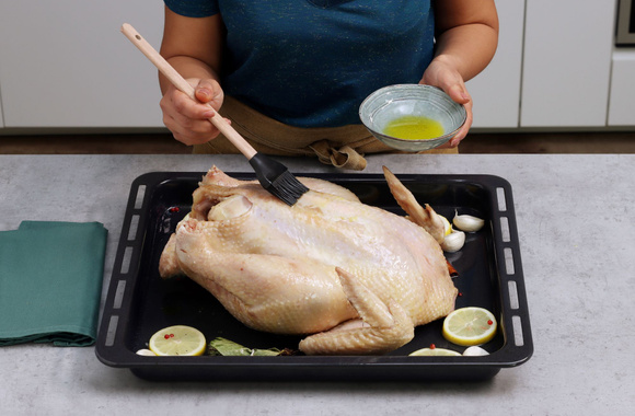 4Déposez le chapon dans un grand plat allant au four, badigeonnez-le d'huile d’olive. Versez la moitié du vin blanc, ajoutez les épices et les rondelles de citron du jus de cuisson. Enfournez et faites cuire pendant 2 heures. Durant la cuisson, arrosez le chapon avec le vin restant ainsi que le jus de cuisson.