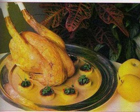 - 11 - badigeonnez généreusement le chapon de beurre. Assaisonnez-le de gros sel. Dans le four préchauffé à 220-240° (therm 7/8) démarrez la cuisson 10 à 15 mn sur une cuisse. Poursuivez 15 à 20 mn sur l'autre cuisse et terminez 20 à 25 mn à plat, suprêmes vers le haut. Arrosez souvent.
