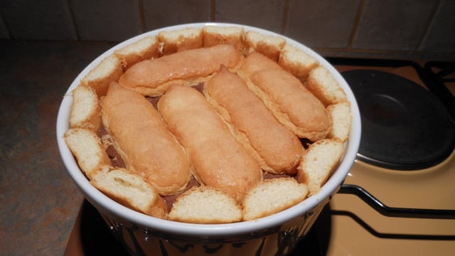 Tapissez votre moule de papier film transparent. Trempez les biscuits dans un peu d'eau et tapissez le fond et les bords du moule à charlotte.