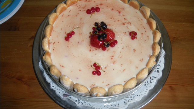 Biscuit à la cuillère disposés en cercle sur fond de biscuit, additionné d'une crème anglaise collée à la gélatine, garnie de fraises