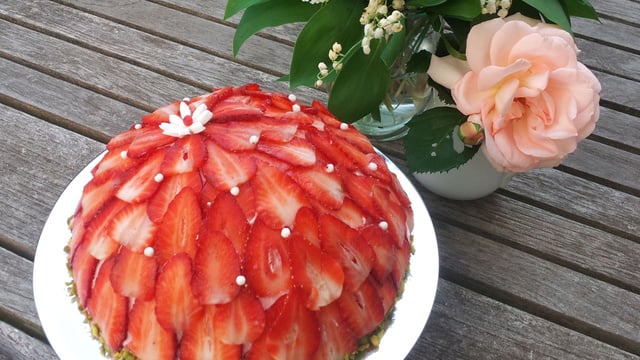 Ecraser les pistaches avec un mortier ou un rouleau à pâtisserie, décorer tout autour du dôme. Equeuter et laver les fraises, sur une planche à découper couper en carpaccio les fraises les déposer délicatement afin de recouvrir totalement le dôme. Décorer de billes et d'une fleur en pâte à sucre. Réserver au réfrigérateur jusqu'au moment de servir.