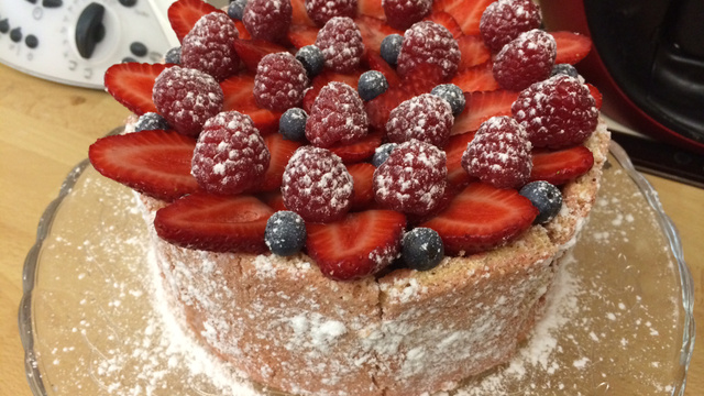 Chemiser si possible de rhodoïd le cercle à entremets posé sur une feuille de papier cuisson, ajouter tout autour la bande de biscuit à la cuillère. Poser un disque de biscuit au fond du cercle. Ajouter à la poche ou à la cuillère une couche de mousse bavaroise puis quelques fruits, recouvrir du second disque de biscuit et renouveler l'opération. Réserver au minimum 2/3 heures au réfrigérateur.