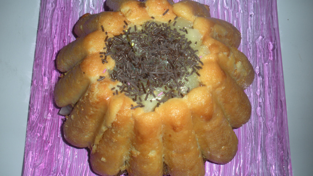 Quand la mousse est bien prise, tremper les boudoirs dans le sirop de poires et les mettre dans un moule à chalotte. Alterner poires coupées en dés/mousse/ poires en dés/mousse boudoirs. Remmettre au frais 3 h. Retourner sur une assiette, démouler décorer avec des vermicelles au chocolat et déguster