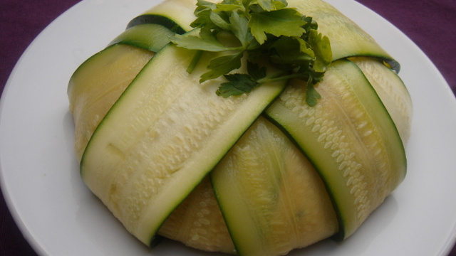 Rabattez les lanières de courgette sur la préparation et réservez au réfrigérateur 3 à 4 heures.