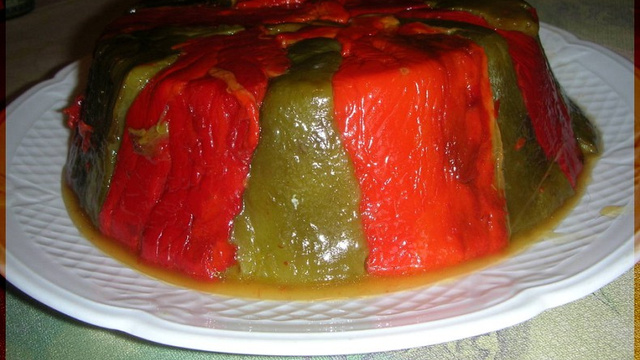 Huilez le moule à charlotte, coupez les poivrons en lanieres , disposez les transversalement en alternant les rouges et les verts et en les faisant remonter le long des parois
