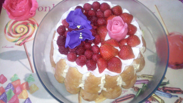 Fraises et framboises, sur un tapis de pâte à sucre blanche et agrémentée de violettes (en pâte à sucre) et d'une rose (pâte d'amande)