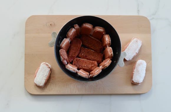 4Tapissez ensuite les parois d’un moule à charlotte (ou un grand cercle à pâtisserie) ainsi que le fond du moule (ou du cercle) de biscuits roses.