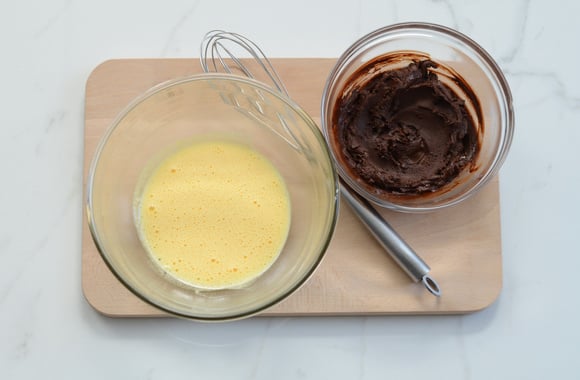 2Ajoutez le mélange chocolat-beurre fondu et fouettez énergiquement.