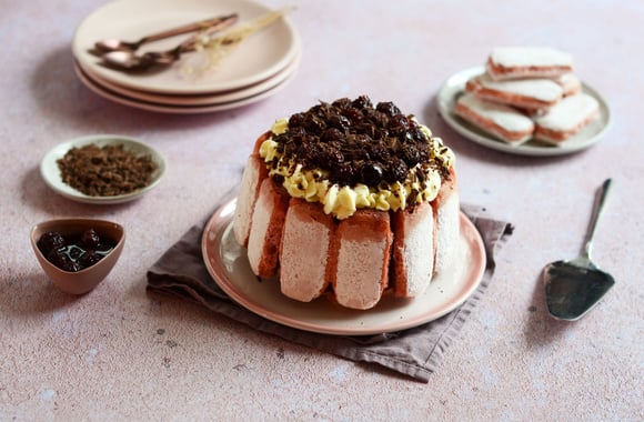 Une charlotte avec une mousse au chocolat aux saveurs de la forêt noire avec des griottes au sirop, des copeaux de chocolat et de la crème montée. La charlotte sera réalisée avec du Biscuit Rose de Reims Fossier ce qui va ramener de la couleur, du fondant et du goût à cette pâtisserie. Et la petite touche d'originalité, c'est l'ajout de la fève Tonka dans la mousse au chocolat.