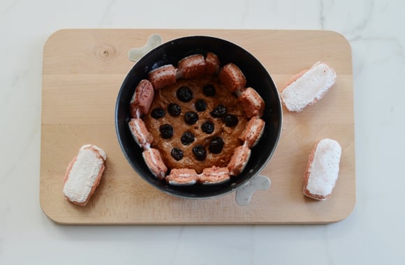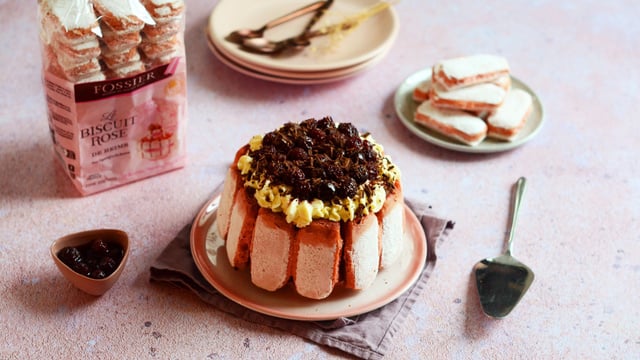 Disposez par-dessus des cerises et couvrez de biscuits roses préalablement imbibées de jus de cerises.