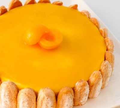 Verser 200 g. de purée d'abricots dans une casserole. Ajouter 300 g. d'abricots coupés en dés. Faire bouillir et incorporer au fouet 4 g. d'agar agar. Placer un cercle de 14 cm de diamètre sur une plaque recouverte de film alimentaire. Verser le mélange à l'intérieur du cercle. Déposer des oreillons d'abricots dans la gelée en enfonçant bien. Faire prendre au congélateur.