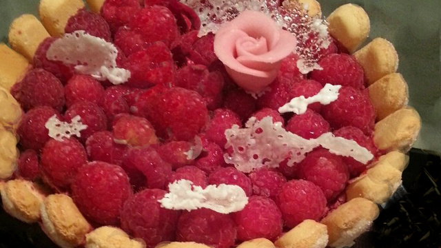 Mousse de fruits rouges, entourée de biscuits à la cuiller, garnie de framboises, de dentelles et rose en sucre.