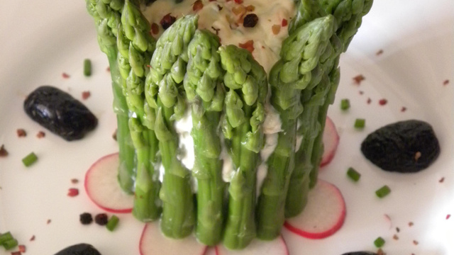 Plonger les asperges dans une casserole d'eau bouillante bien salée, pour les faire blanchir. Au bout de 4 minutes, les ressortir et les plonger dans un saladier d'eau glacée (pour fixer la chlorophylle et permettre aux asperges de conserver leur belle couleur verte). Les égoutter et réserver.