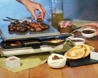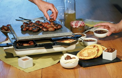 assiette placée sur un bain-marie pour les garder chauds.Le jeu consiste (à l'aide d'un appareil à raclette pierrade) à faire une