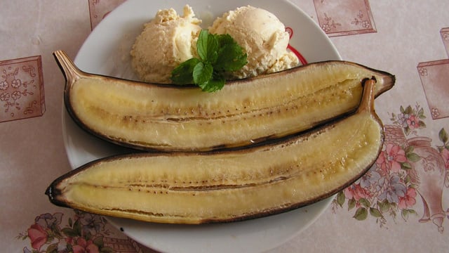 Poser deux morceaux de bananes par assiette avec 2 boules de glaces. Décorer de menthe et servir aussitôt.