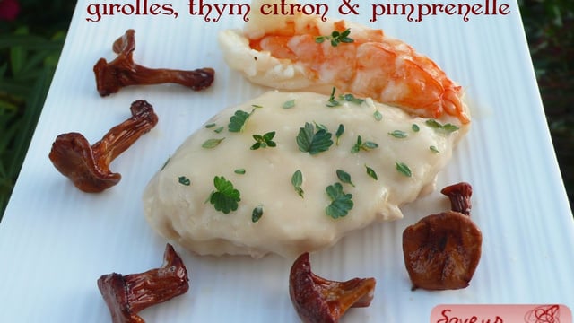 Faire sauter les girolles et les gambas dans un mélange huile/beurre avec du thym citron, saler et servir avec le chaud-froid de pintade aux herbes.