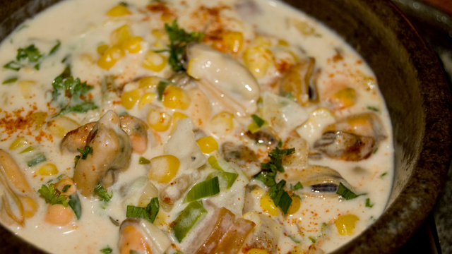 Ajouter le maïs, le lait et la crème fraîche. Dès que l'ébullition a repris, diminuer la chaleur et ajouter les moules et les lardons.
