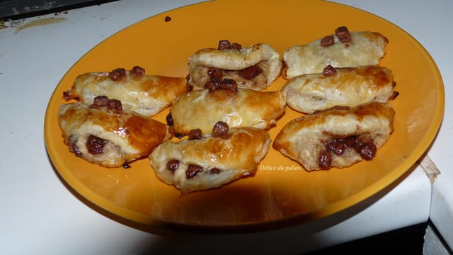 Prendre un rond de pâte, y déposer 1 c à s de compote voire + selon diamètre et rajouter quelques pépites de chocolats, badigeonner les rebords de jaune d'oeuf et refermer le chausson.