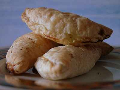 - Découper des cercles dans la pâte (environ 10 cm de diamètre) puis déposer la farce au centre du cercle et rabattre la pâte en pinçant les extrémités.