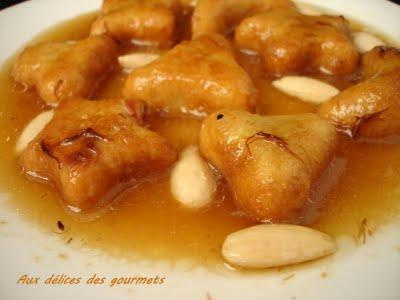 La riche cuisine algérienne reflète la variété culturelle du pays , des plats traditionnels qui varient de ville en ville. J'ai choisi de vous présenter aujourd'hui un plat sucré de fêtes qu'on surnomme Chbeh Essafra Ce plat est composé d'une pâte d'amandes frite et d'une sauce sucrée safranée bien parfumée à la cannelle. Au moment de servir, mettre les triangles de pâte d'amandes dans une assiette et les napper de sauce, les accompagner d'un morceau de viande et parsemer d'amandes.