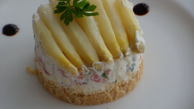 Verser cette préparation sur les fonds des cheese-cakes, poser les asperges coupées à la dimension des cercles par-dessus et remettre au frais jusqu'au moment de servir.