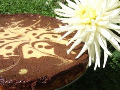Vous connaissez mon penchant pour le chocolat ... alors je n'ai pas hésité à en mettre dans la préparation de ce cheese cake, et ça lui donne un petit look bien sympathique...