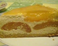 Un cheese cake parfumé à la vanille avec des médaillons d'abricot recouvert d'un mirroir à l'abricot.