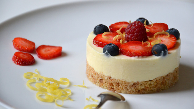 Placer au réfrigérateur minimum 4h. Avant de servir, déposer des fruits rouges et des zestes de citron (le 1/3 restant) sur le dessus de votre cheesecake. Servir bien frais.